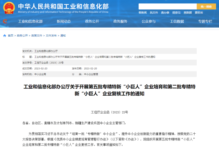 中华人民共和国工业和信息化部于2月20日印发通知,组织开展第五批专精特新“小巨人”企业培育。